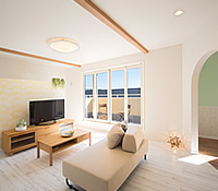 リビングとキッチン・ダイニングをアーチ壁で分けることにより、「食事をする空間」と「くつろぐ空間」同じ部屋に二つの空間を作りました。リビング横に広々としたバルコニーを配置しました。ちょっとしたガーデニングや第二のくつろぎ空間として豊かな時間を過ごすことができます。